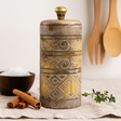 Цилиндричното тяло е разделено на тихи ленти чрез хоризонтални канали, докато изпъкналите резби — спирали, диаманти и мотиви, наподобяващи листа — придават текстура, която можете да усетите. Куполният капак с заоблен дръжка се затваря с приятно докосване. Износеният завършек позволява да се вижда дървесната шарка; меки златисти акценти галят релефа, създавайки деликатна игра на светлината. Изработен в Индонезия, където дърворезбата е дълго практикувано изкуство, неговите ритмични мотиви отдават почит на природата и търпеливата ръчна работа. Поставете го на конзола или бюро за бижута, сувенири, ключове или малки канцеларски материали; в кухнята за чайни пакетчета или опаковани сладкиши. Замислен подарък за нов дом или за някой, който цени фино изработените детайли. 🗝️