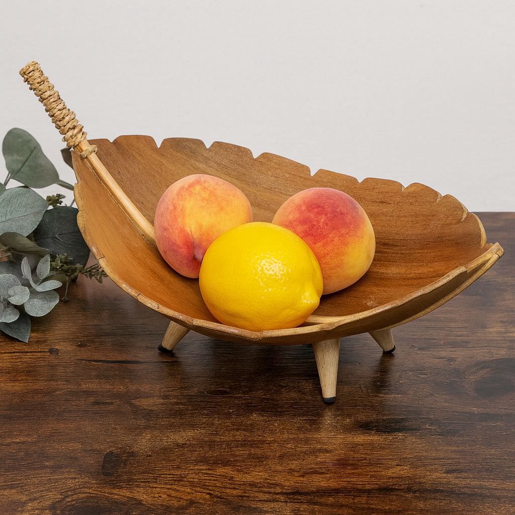 Ръчно издълбано в Индонезия от отговорно добити кокосови листа, то запазва естествения релеф с гладка, вдлъбната вътрешност и матово до полуматово покритие. Топлите кафяви тонове се издигат от по-светъл бежов по централния ребро и ръба; назъбеният ръб, изпъкналият жилка и късият, оплетен с въже дръжка стоят на разперени крака за стабилен, скулптурен профил. Прибл. 31 см дължина x 23 см ширина x 6 см дълбочина; всяко парче е уникално. В много индонезийски общности кокосовата палма — често наричана „дървото на живота“ — символизира находчивост и ежедневна храна; този дизайн тихо почита тази връзка с природата и занаятчийството. Поставете го на масата за хранене с сезонни плодове или хляб, на входа за ключове или на масичката за кафе като прост фокусен елемент. Избършете с влажна кърпа и го дръжте сухо. 🥥