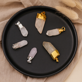 Създаден от естествен прозрачен кварц, всеки медальон показва своя характер: полупрозрачно тяло, мека мъгливост и слаби ивици, с нюанси, вариращи от прозрачен и млечно бял до най-светлия руж, сив или блед виолетов. Неполираният връх запазва своя неправилен завършек, докато органично оформен капак с позлата в златист или сребрист тон държи интегрирана халка за лесно носене. В много традиции прозрачен кварц се цени като символ на яснота и фокус — често се държи в медитативни пространства като прост знак за връщане към дишането. Острият му вид подсказва посока и намерение; среброто обикновено се свързва със спокойна яснота, а златото с топла жизненост, добавяйки фин слой смисъл към изделието. 🌙