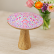 🍄 Гладка дървена форма среща ръката с тиха тежест: заоблен капак, почиващ върху стеснена основа с естествена текстура в топло кафяво. Капакът е ръчно рисуван с калейдоскопичен цветен навес — венчелистчета и листа в розово, оранжево, лилаво и зелено — с меки и нежно заоблени ръбове.