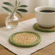 Изработен от естествен юта, смесен с мек памук, шнурът е навит в концентрична спирала и внимателно зашит, за да запази формата си. Центърът е топъл тен; бордът е изискан маслинен зелен. Кръгъл, плосък и с нисък профил за стабилен баланс. Всеки подложка е с диаметър 10 см; комплект от четири. Текстурата е леко грапава, с гладък ръб, който е нежен към деликатни повърхности. Ръчно тъкан в Индия. 🧵
