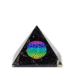 Малка оргонитна пирамида с размери приблизително 5,5 см ширина и 4,5 см височина, с изображение на символа Цвете на живота и парченца черен турмалин, вградени в прозрачен смолист материал.