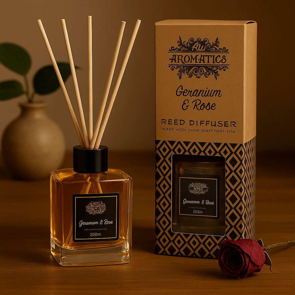 Нежният ритуал на атмосферата: естествените ратанови пръчици поемат топла, златиста смес от гераниум и роза, а стаята омекотява в присъствие. Тих спътник за всекидневния живот. 🌿🌹