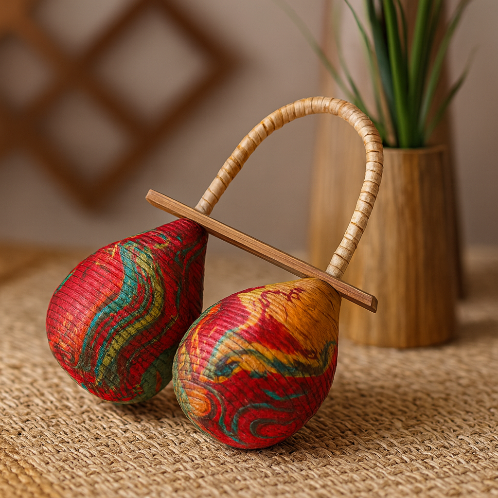 С корени в латиноамериканската музика и танци, маракасите поддържат ритъма в стилове като салса, кумбия и сон — перкусионален глас, чуван на паради, социални събирания и улични празненства. Традиционно изработени от тикви или дърво, тази ратанова интерпретация почита тази традиция с обмислена форма с двойна примка: два крушеобразни резонатора, свързани за отзивчиво, многопластово разклащане. Повърхностите имат деликатна спирална текстура и топло, многоцветно покритие, добавящо тактилен комфорт и щипка цвят без отблясъци. 🎶