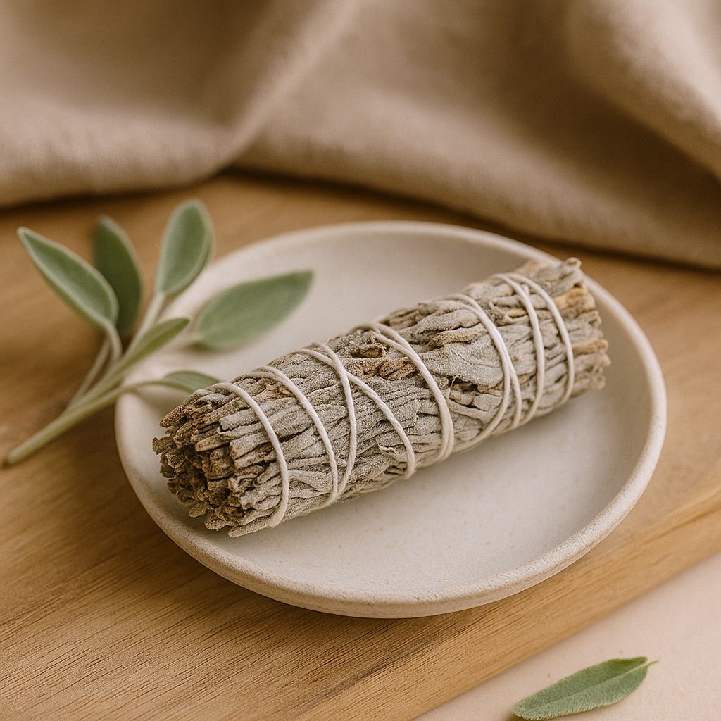 Ръчно вързан сноп от сиво-сини листа от градински чай, увит с бял памук, този пръчка за опушване е древен инструмент за пречистване. Димът му носи мек, билков аромат с нежна, лавандулова нотка. 🌿