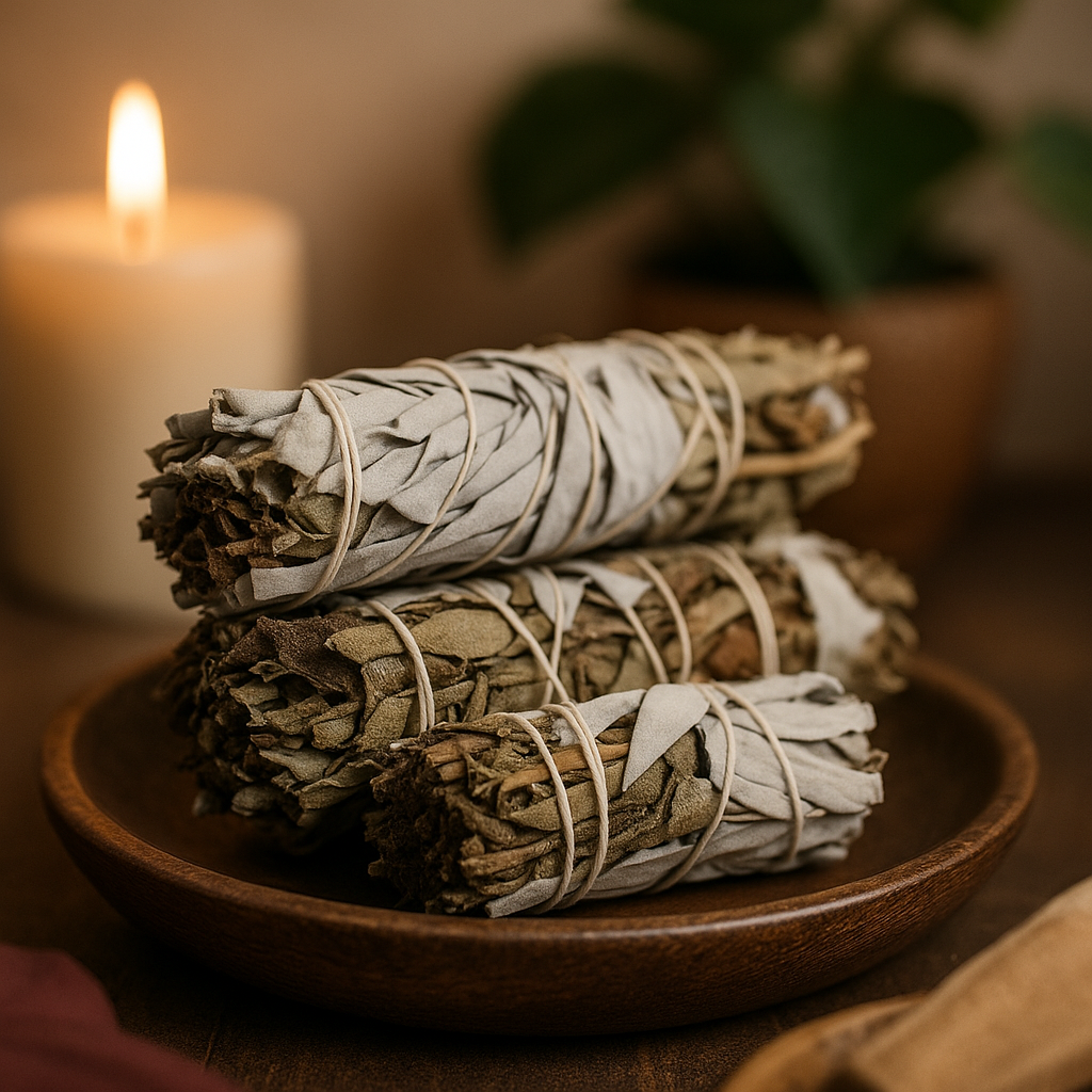- 🍃 Свещени билки: Бял и черен градински чай, ръчно вързани за заземено, традиционно горене.