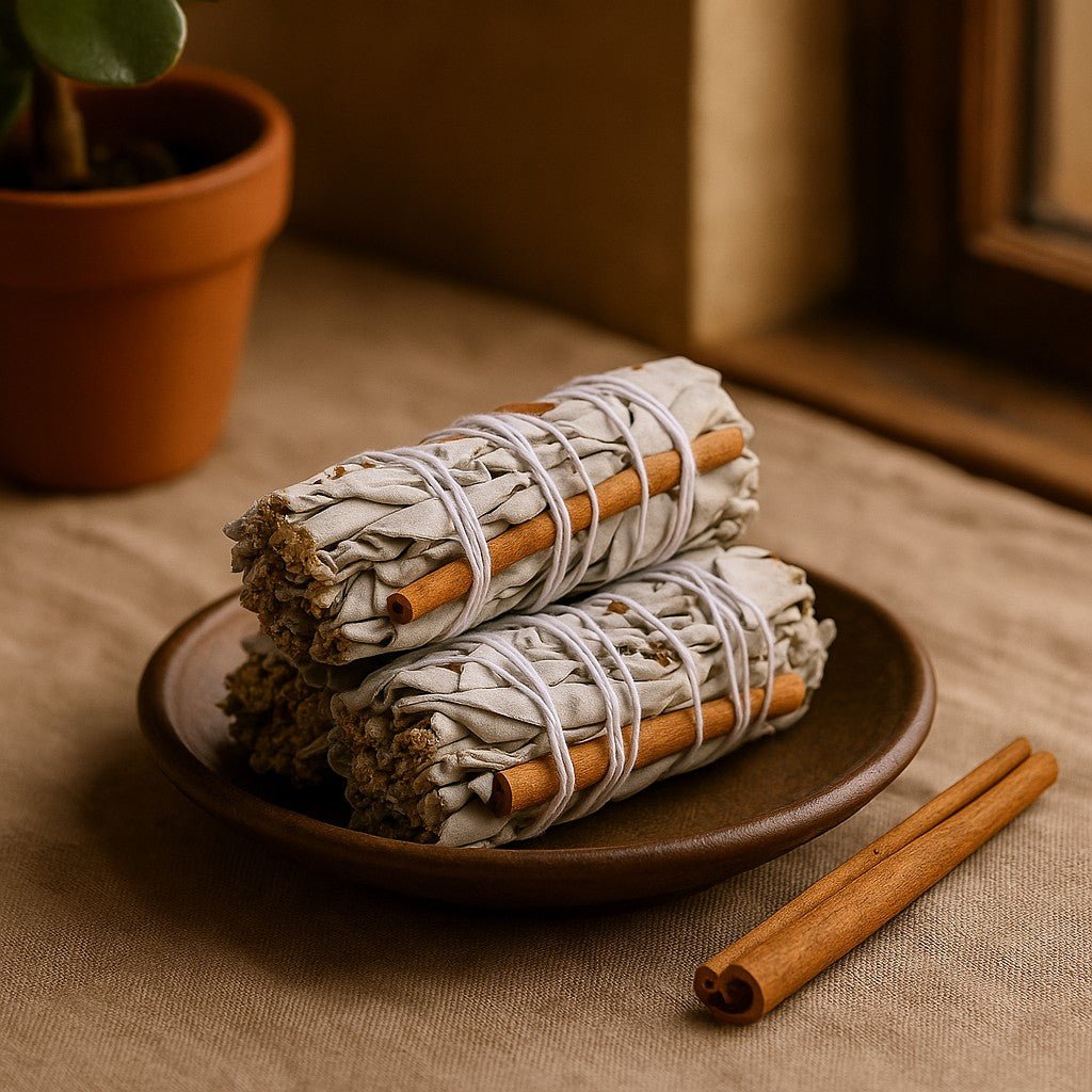 Ръчно вързан сноп от бяла салвия и канела, древен инструмент за пречистване, предлага ясен, билков дим, затоплен от нежна подправка. Бледосивозелените листа са вързани с бял конец; тънката кора от канела лежи по снопа за естествен, рустикален вид. 🌿