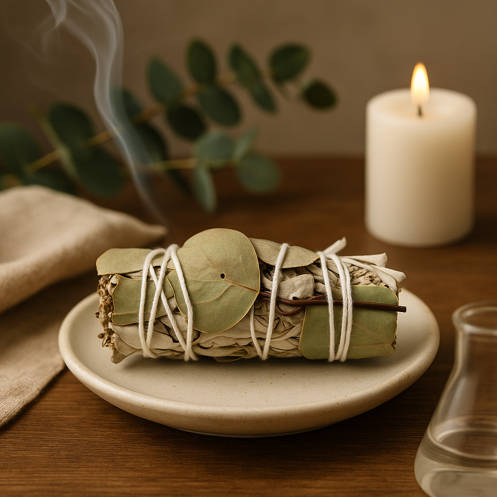 Първата извивка на дим се издига хладна и билкова — сухата, смолиста острота на бялата салвия се среща с хрупкавото, камфорово повдигане на евкалипта. В продължение на поколения церемониалното пречистване с дим се използва в много култури, включително от коренните народи на Северна Америка, като прост акт на пречистване и размисъл. 🌿🔥