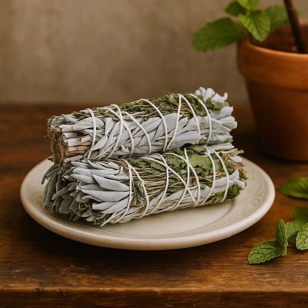 Компактен, ръчно вързан сноп от бледи, сребристи листа от градински чай с нотки на зелена мента лежи леко в ръката — сух, матов и вързан с проста бяла връв. Бял градински чай (Salvia apiana) отдавна се използва в коренни церемонии в Северна Америка като пречистващ дим и предложение за уважение; ментата носи свеж, ярък нюанс, често свързван с яснота и освежаване. 🌿