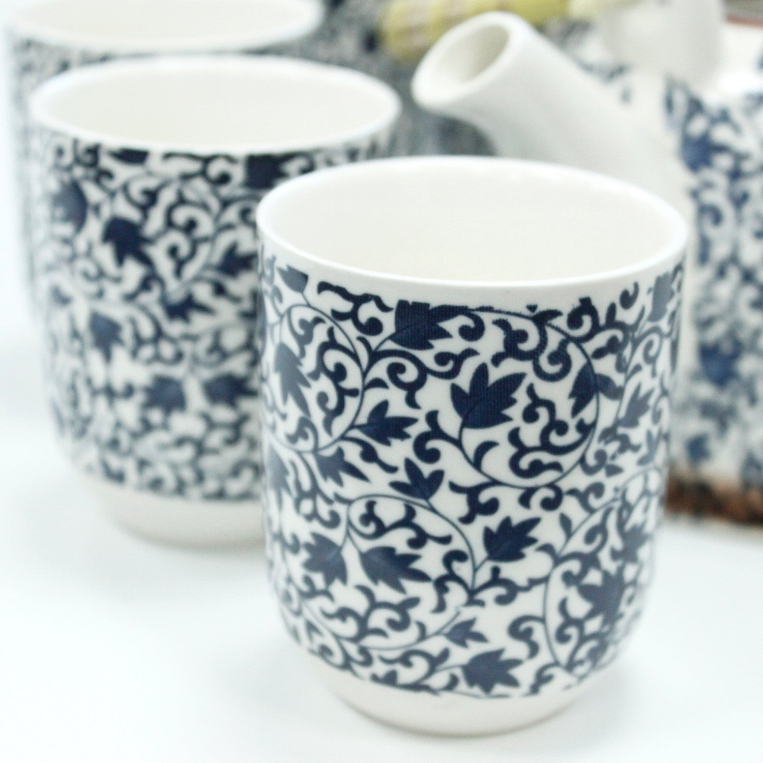 Наливането е тихо и съсредоточено. Под широкото отваряне се намира подвижен метален инфузер с фина мрежа, който позволява приготвяне с насипен чай и простота без чайни пакетчета. Шест чаши без дръжки отразяват същия синьо-бял мотив; техните прави страни затоплят дланите и насърчават неспешни глътки. Лъскавото покритие е издръжливо и успокояващо на масата, с деликатни кафяви акценти по ръба, добавящи земен, стабилен нюанс. 🍃