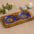 Правоъгълната дървена форма е гладка на допир, с леко заоблен ръб. Вдлъбнатите квадратни отделения запазват формата си с меки ъгли, докато лъскавият тъмносин емайл е украсен със златисти мотиви: полумесец с лъчи, сияещо слънце с спокойно лице и малки звезди. Естествената текстура и живият синьо-златист цвят са в хармоничен контраст. Използвайте го за носене на чай или малки хапки, подреждане на подправки или създаване на прост олтар, като поставите свещи, държачи за тамян или скъпи предмети — превръщайки повърхността в обмислена сцена за гостоприемство или тихо размишление.