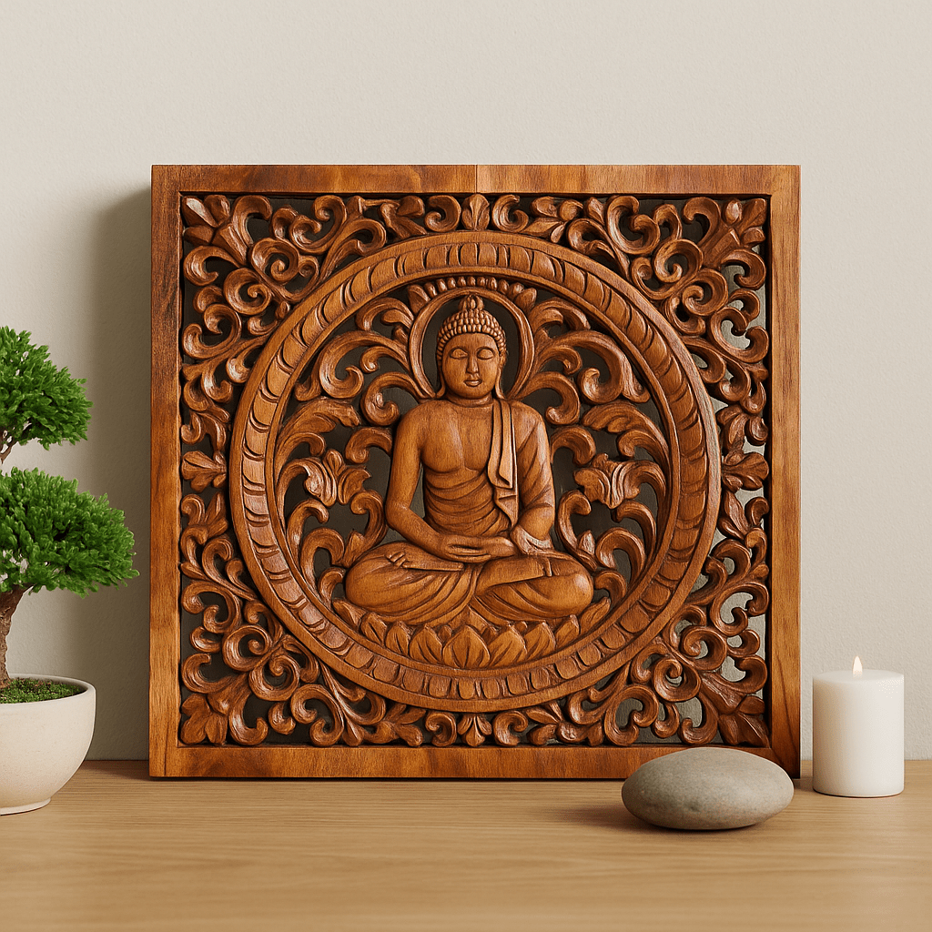 В центъра Буда се появява в мирна медитация — напомняне, в будистките традиции, за състрадание, осъзнатост и вътрешен баланс. Фигурата почива върху основа от лотус, символ на чистота и устойчивост, издигащ се ясен и недокоснат. Концентричните кръгови рамки отразяват езика на мандала, често използван за представяне на цялост и цикли на живота, докато симетричното растително издълбаване около медальона предполага жив растеж и нежна защита. Интегрираната квадратна рамка закотвя произведението, придавайки стабилност на течащите форми. 🪷