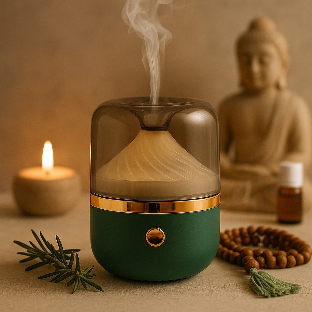 A soft ribbon of mist rises through a smoky, domed top, held by a warm bronze accent over deep green. This electric diffuser blends quiet technology, refined beauty, and everyday well‑being. With one gentle button and a calm, color‑shifting glow, it settles easily into a bedroom, living space, or desk. ✨