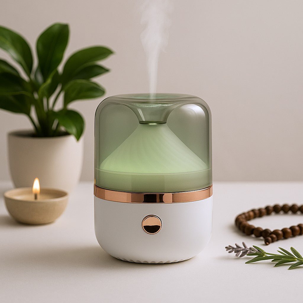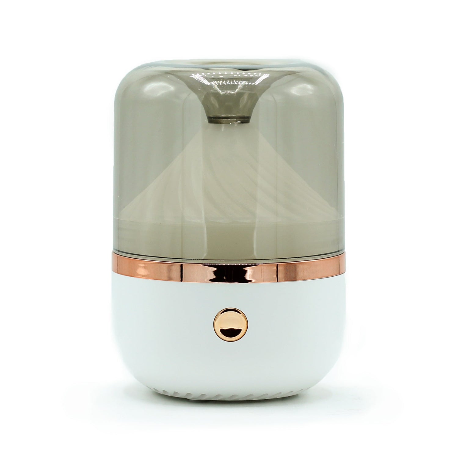 A soft halo of color settles through the smoky top as a fine mist rises from the central opening. This compact diffuser blends quiet technology with a clean, modern silhouette—smooth curves, a warm metallic ring, and a calm white base—bringing beauty and ease to your space. 🌫️