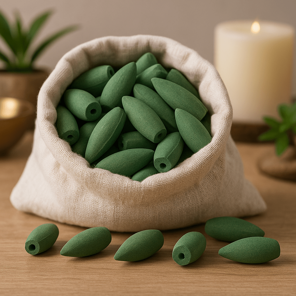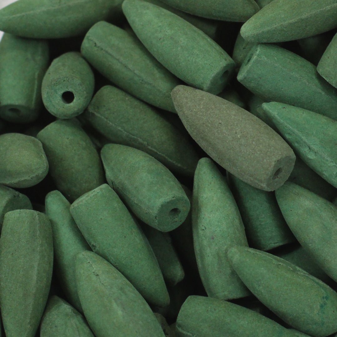 Frankincense and myrrh meet here in an elegant duet: bright resin with gentle citrus, warm balsam, and mellow earth. Each matte green cone, softly compressed and finely textured, is shaped like a small teardrop with a hollow at the base; once lit, the smoke grows heavier than air and cascades through your backflow burner in silvery curls, pooling like mist over stone. 🌀