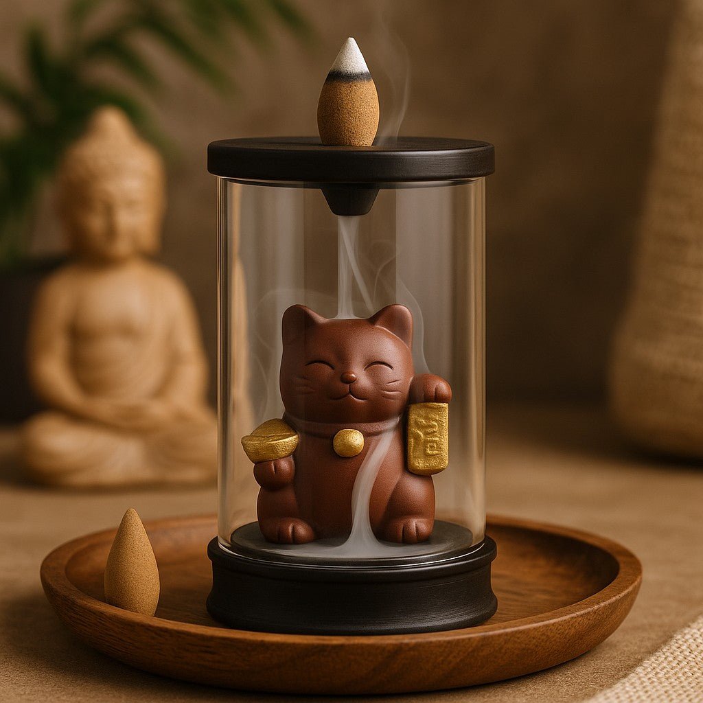 The room settles; a cone is kindled; and a soft hush arrives. Inside a clear column, smoke begins to fall in a gentle, waterfall-like stream — a quiet scene that gathers your attention and steadies the moment. Within, a beckoning cat rests in stillness, long regarded across East Asia as a sign of welcome and good fortune, inviting a pause of simple presence. 🌫️
