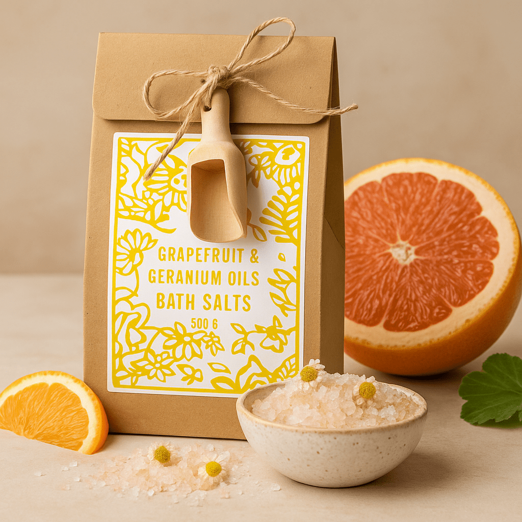 Presented in a natural kraft bag with a clean white label framed by a soft yellow botanical motif, a small wooden scoop rests neatly on twine. Inside, mineral crystals are infused with grapefruit and geranium essential oils for a crisp, lively aroma; chamomile flowers add a gentle, herbal calm and a speckled, artisanal look. As the grains dissolve, the water turns softly silky with a touch of vitamin E and the quiet comfort of naturally occurring trace minerals.