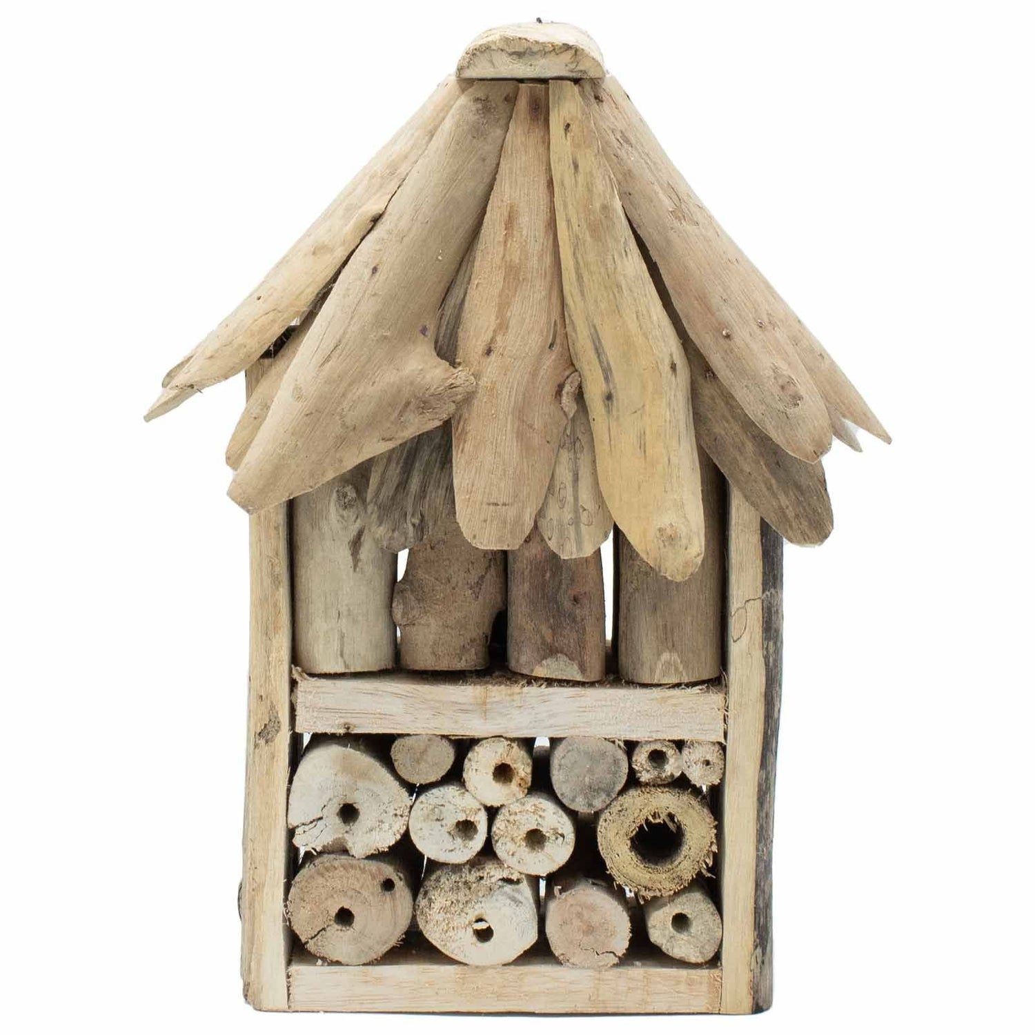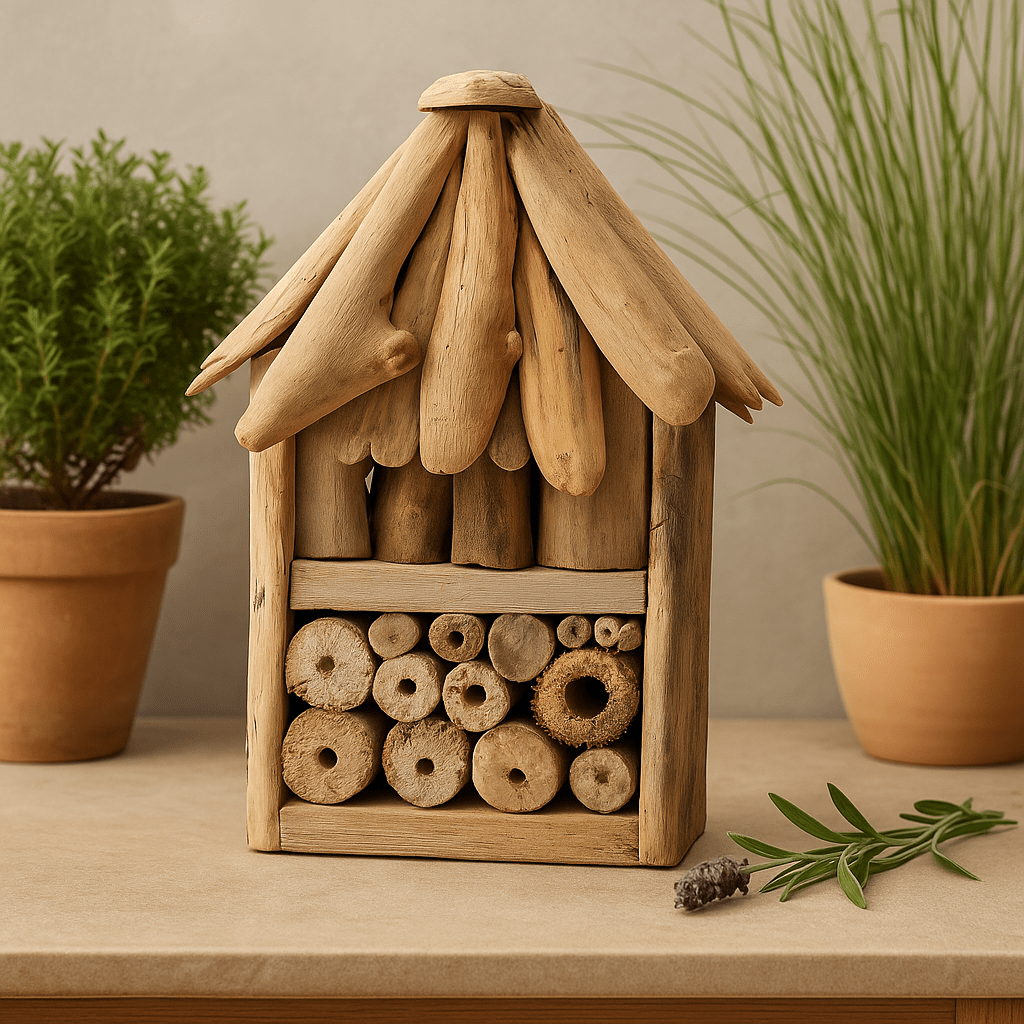 Crafted from natural, unfinished wood with a driftwood-like patina, the house form feels warm and grounded. A pitched, shingle-style roof helps shed rain, while the open front reveals compartments of cut logs and hollow tubes with varied diameters. The visible grain, knots, and organic edges give each piece a calm, rustic character that settles beautifully among plants and stone. Built to live outdoors, it will slowly silver over time, blending into the garden’s rhythm. 🪵