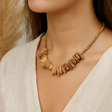 Crafted from natural gemstone, the front gathers irregular, flat slabs—stacked edge‑on for an organic silhouette—then eases into small rounded beads for a smooth, closely strung drape. The tactile finish invites a slower touch. Often likened to jasper for its earthy character, Map Stone is appreciated for patterns that resemble landscapes; across many traditions, such stones are associated with steadiness, presence, and a grounded way of moving through the world. Here, the terrain-like markings become the motif themselves—a quiet compass for curiosity and belonging. 🧭