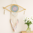 A lace-like center opens into a fine web; below, hand‑knotted strands taper into a gentle fringe that sways with the slightest breeze. Pastel tones lend a soft glow by day and a tender silhouette by night. Hang it above the bed, near a window where light can move through it, or along a hallway for a grounded, welcoming presence. A thoughtful gift for a soothing bedroom or a new home. 🪶