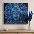 A stylized Buddha with softly closed eyes rests at the center, framed by concentric, petal-like motifs that form a mandala. White highlights glow against deep midnight tones, while a darker edge adds soft contrast. The matte, textured surface shows fine brushwork, and the slight gaps between panels give the image a measured, harmonious rhythm. 🔵