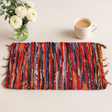 Woven in India in the chindi rag-rug tradition, thick recycled fabric strips are interlaced to create a plush, textured surface with a smooth, velvety touch. The light plays softly across reds, blues, purples, mustard and green, grounded by black and white. Short, natural fringe at the ends and subtle variations in strip thickness celebrate the piece’s handcrafted character. 🌈