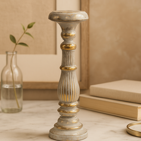 Hand-carved in Indonesia from sustainably sourced albesia wood, it rises from a round, stepped base to a small, gently dished top with a subtle rim that holds the candle securely. The turned, column-like shaft is detailed with vertical fluting and ringed bands. A softly distressed off-white finish reveals deeper undertones, while metallic gold highlights trace the edges and catch the light. The surface feels smooth with the faint ripple of carving—an inviting texture that adds warmth to the flame. ✨