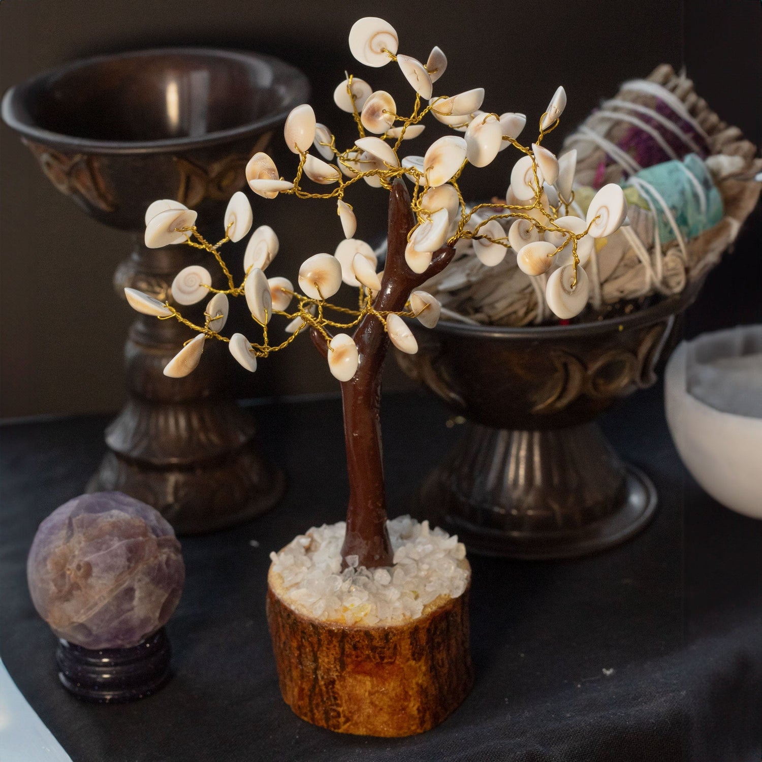 A serene tabletop tree catches the light with gentle spirals and warm wood. A dark, smooth trunk rises into fine gold-colored branches, tipped with creamy shell-like “leaves.” The bark-textured base sits steady, its surface scattered with translucent chips that glimmer softly. 🌀🌿