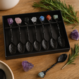 Glossy black bowls catch the light, while rough, gem-like toppers bring a pleasing, tactile contrast. Seven ornate spoons arrive gathered in a dark, botanically framed box, inviting a pause before use. Beauty and mindful design to honor the small rituals of your day.