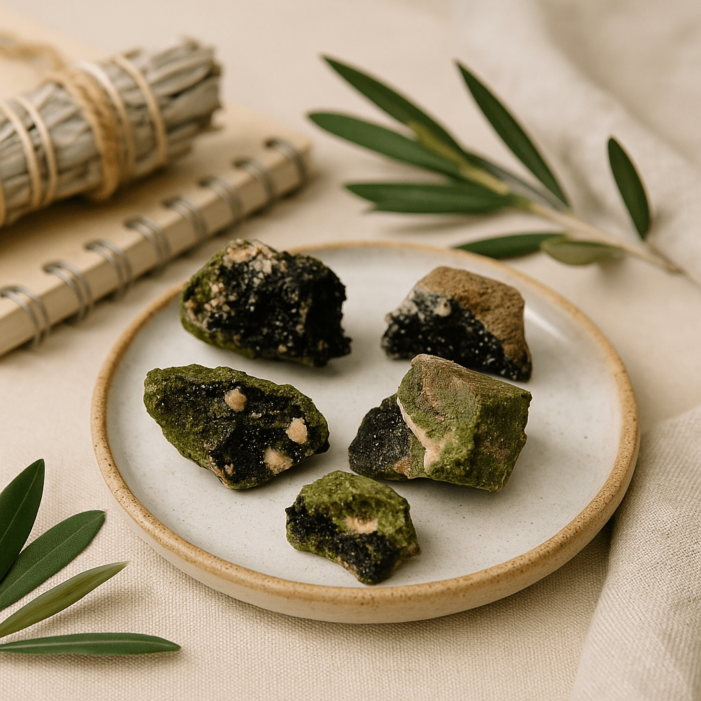 Formed in Morocco, each fragment shows a natural contrast: matte olive matrix with drusy, glossy crystals tucked into vuggy textures and along broken faces. Their rough surfaces invite simple, tactile presence — a reminder to slow down and notice what is real and enduring. In many cultures, crystals have long been kept as carriers of intention and memory; epidote, with its green tones, is commonly associated with growth, grounding, and renewal. It sits well on an altar or shelf, supports a focused atmosphere on a desk, and can be held during quiet practice — some choose to keep a piece in the hand or rest it on the thigh while meditating. ✨