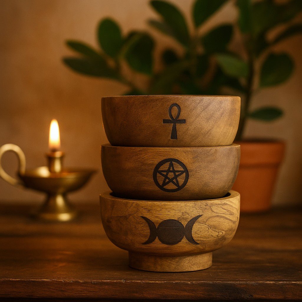 Shaped with gently curved sides and a rounded rim, the natural medium‑brown wood shows living grain and darker streaks, finished to a matte–satin touch. Burned, etched motifs on the exterior include classics such as the ankh, a pentagram within a circle, or the triple‑moon; in many traditions these are associated with life, elemental harmony and protection, and the moon’s cyclical wisdom. Designed for standard incense cones, the smoke rises in soft curls from the bowl. Measures approximately 11 × 6 cm. 🌙