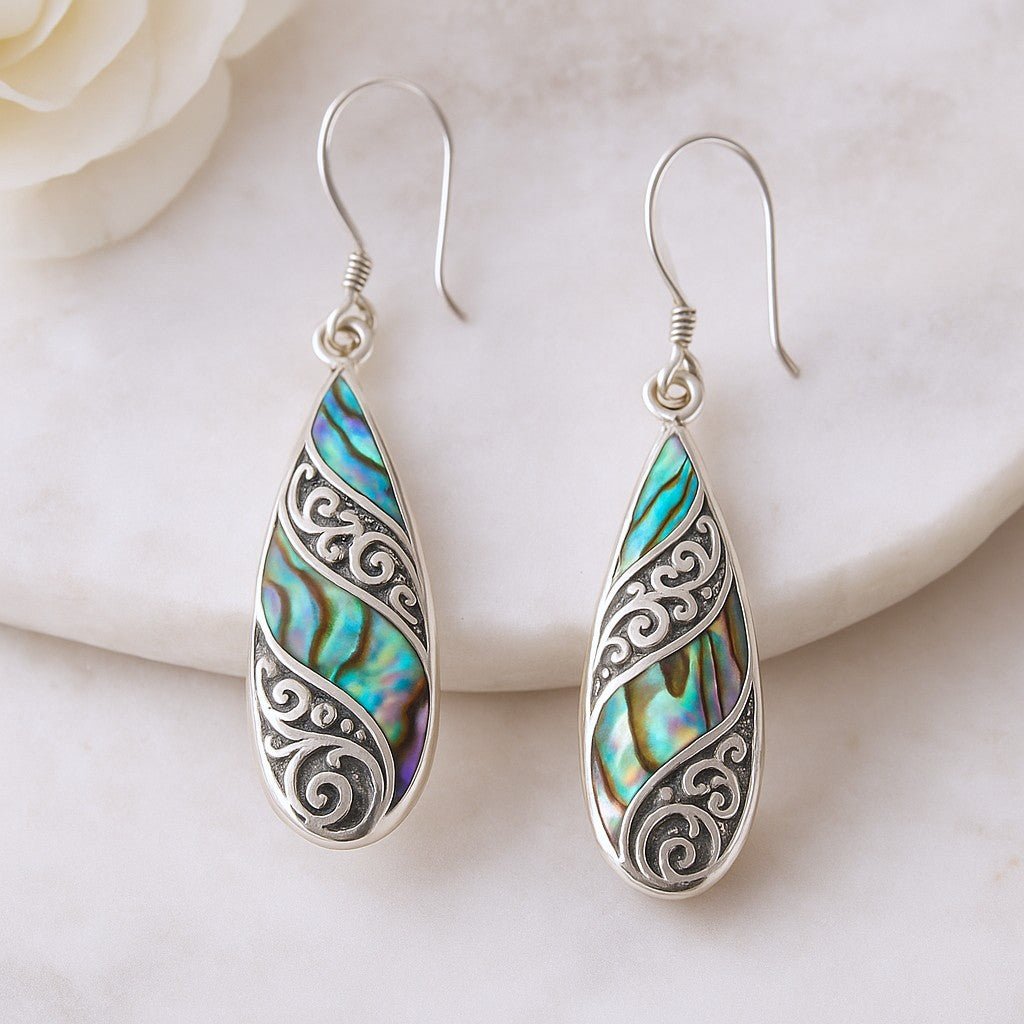 A slender teardrop catches the light and releases a calm shimmer. Iridescent bands play in green, teal, blue, and violet, set against silver‑tone scrollwork that feels delicately carved and quietly bold. These are wearable art—graceful, fluid, and expressive. 🐚✨