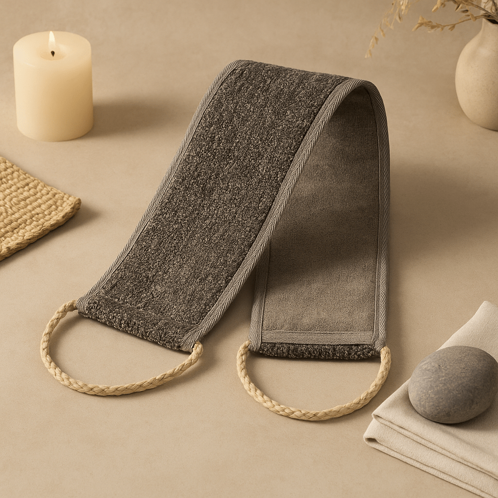 A simple, elongated strap with braided loop handles helps you reach shoulders and back with ease. Edges are neatly bound, the palette calm and neutral, and the focus purely on feel and function — no prints, just the quiet contrast of textures. Rinse well after use and hang by the loops to dry. 🚿