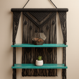 Suspended from a single loop, this macramé shelf brings a quiet touch of nature and craft to the wall. Black, hand-knotted cotton lends a soft, textured frame, while turquoise wooden tiers with a gently weathered finish let the wood grain show through. A delicate fringe falls behind, creating a calm backdrop that softens the silhouette. 🌿