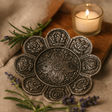 A scalloped, flower-like silhouette frames a central circular well, with an intricate floral rosette in high relief. The silver-toned surface shows gentle darkened recesses for an antiqued depth, while beaded borders and petal-shaped lobes add tactile texture. Among the raised motifs, Tibetan auspicious symbols may appear—such as the endless knot, which in Tibetan Buddhist art signifies interconnection and continuity. Sized at 12 cm, it suits most standard incense sticks and flat-based cones. 🕯️
