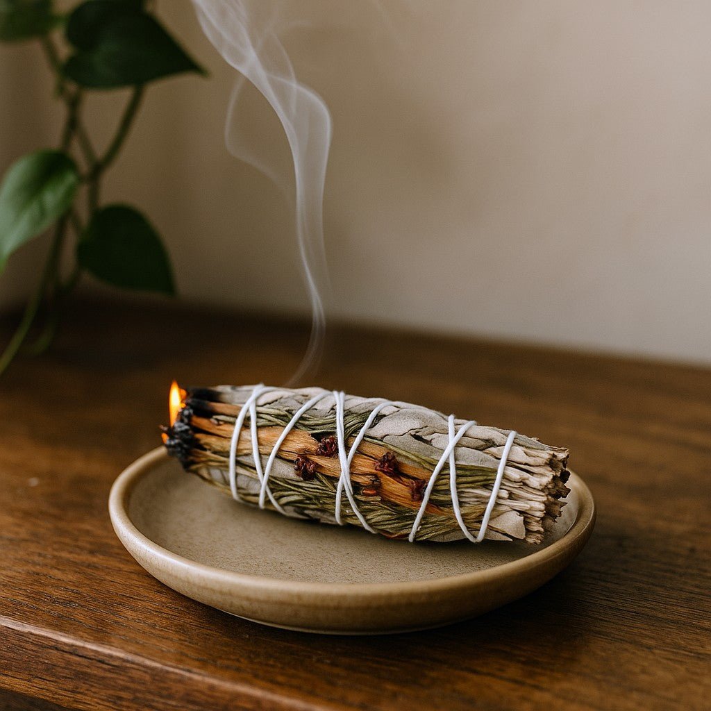 Cool, herbaceous leaves bound by white cotton form a hand-tied bundle of sacred aromatics — an ancient tool of purification used across cultures to mark transitions and set intention. The term “smudging” comes from Indigenous North American traditions and is approached with respect and care. 🌿
