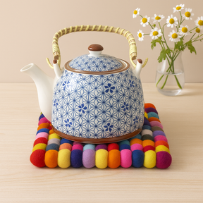 Handmade in Nepal from closely packed felted wool balls, its 20 cm square shape brings a clean edge and gentle structure to the table’s natural flow. The multicolour palette adds character without fuss, while the dense wool offers reliable insulation for mugs, teapots, and warm serving dishes. Not suitable for direct contact with very hot cookware. The surface is easy to keep fresh — shake out crumbs, use a lint roller, and blot spills with a damp cloth; lay flat to air dry. 🧶