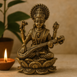 This handcrafted figure honors Goddess Saraswati, revered across Indian traditions as the embodiment of wisdom, music, and learning. Her veena signifies the harmony of knowledge and creativity, the book reflects study and insight, and the lotus speaks to clarity and purity. Many keep her near a desk, instrument, or home altar as a quiet reminder to practice with focus and joy.