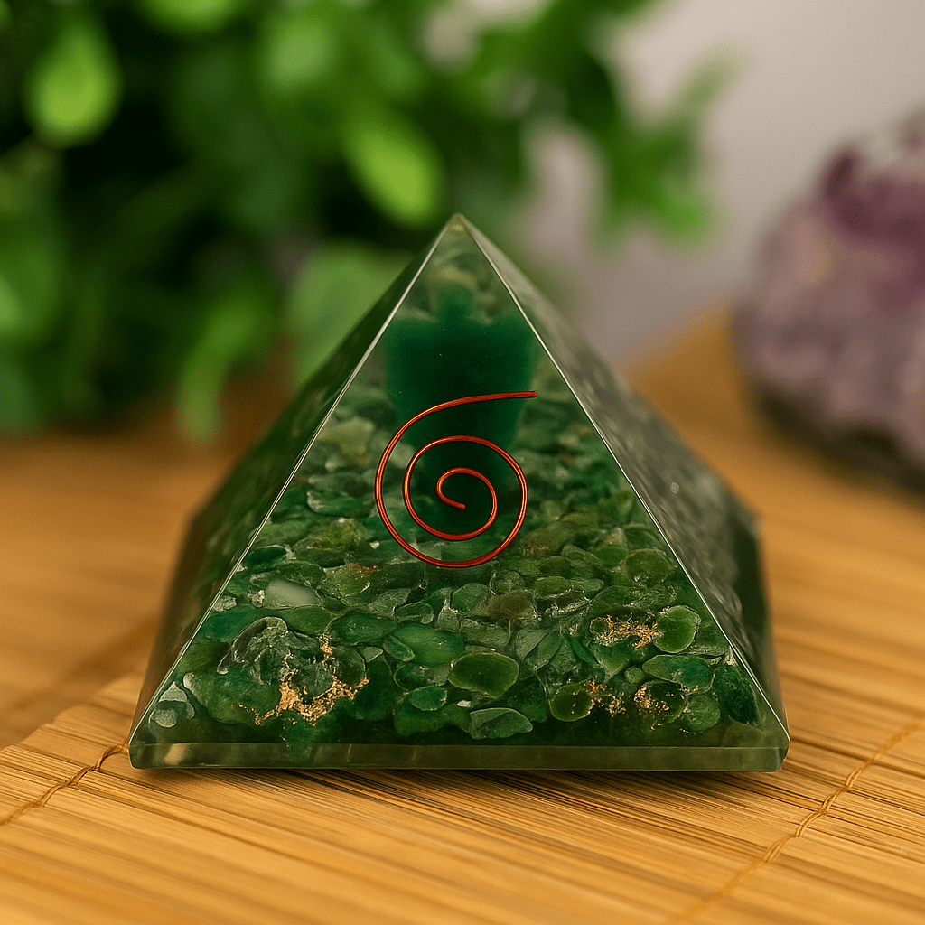 Cool to the touch and softly luminous, this orgone energy cone is crafted to honor the idea of harmonizing space and intention. Its clear, polished resin body reveals green stone fragments, flecks of gold-toned metal, and a copper spiral near the surface—details that catch the light and invite a quiet moment of focus. 🌀