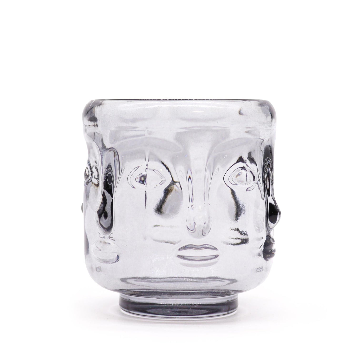 A warm, steady glow rises from a pillar set in smoky grey glass, its light catching the calm contours of serene faces in relief. Quiet and grounded, it’s a companion for stillness, gatherings, and simple rituals — a timeless source of light and calm.