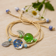 A tiny bloom held between clear glass, this bracelet carries a quiet piece of the garden at your wrist. Real blossoms are gently pressed and preserved, their colors and fine veins visible with every turn of the light. Set on a soft, natural beige cord with subtle knots, it wears light and easy throughout the day.