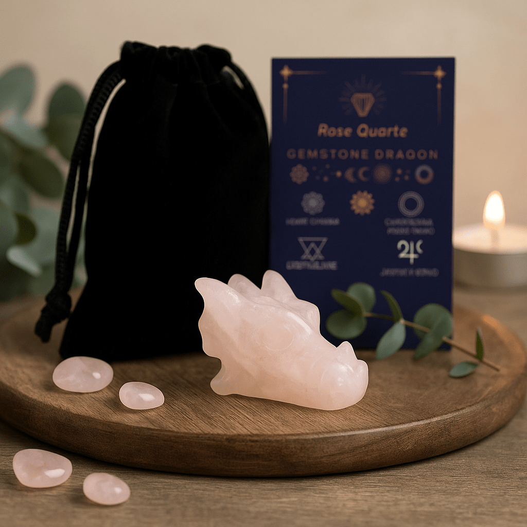 Carved in China, where the dragon carries a long tradition as a symbol of vitality, wisdom, and auspicious power, this piece stands as a calm reminder of inner steadiness. Rose quartz is widely associated with kindness and care of the heart; many keep it close as a gentle cue toward compassion in daily life. The accompanying card notes commonly shared associations such as the heart center, zodiac signs, and planetary symbols—offered for those who enjoy layers of meaning without obligation or promise.