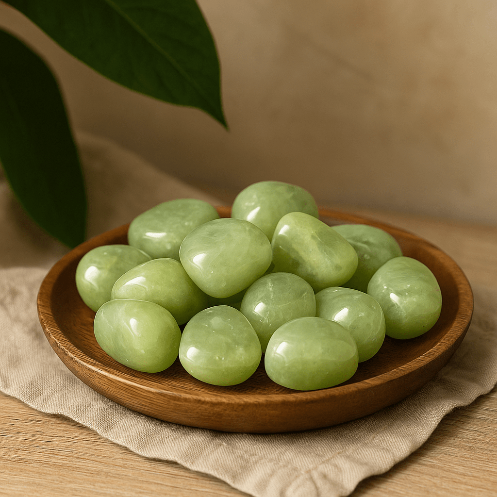 Gemstone focus: Traditionally, prehnite is associated with serenity, compassion, and attunement to the rhythms of nature. It is commonly linked with the Heart Chakra (Anahata) — and, for some traditions, the Solar Plexus (Manipura) — as a gentle support for balance and openness. In zodiac lore it often resonates with Virgo and Libra, offering a steady, heart-centered presence in meditation spaces and daily rituals.