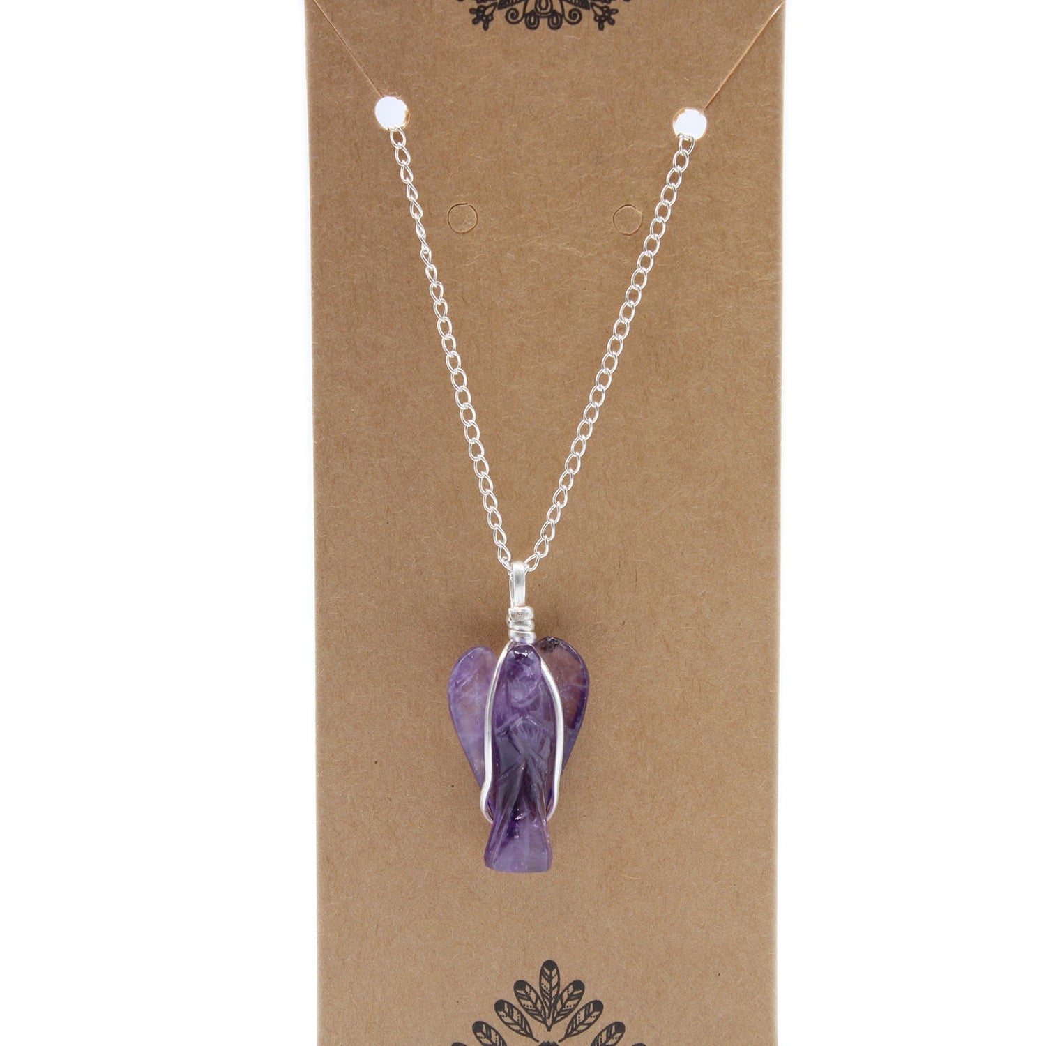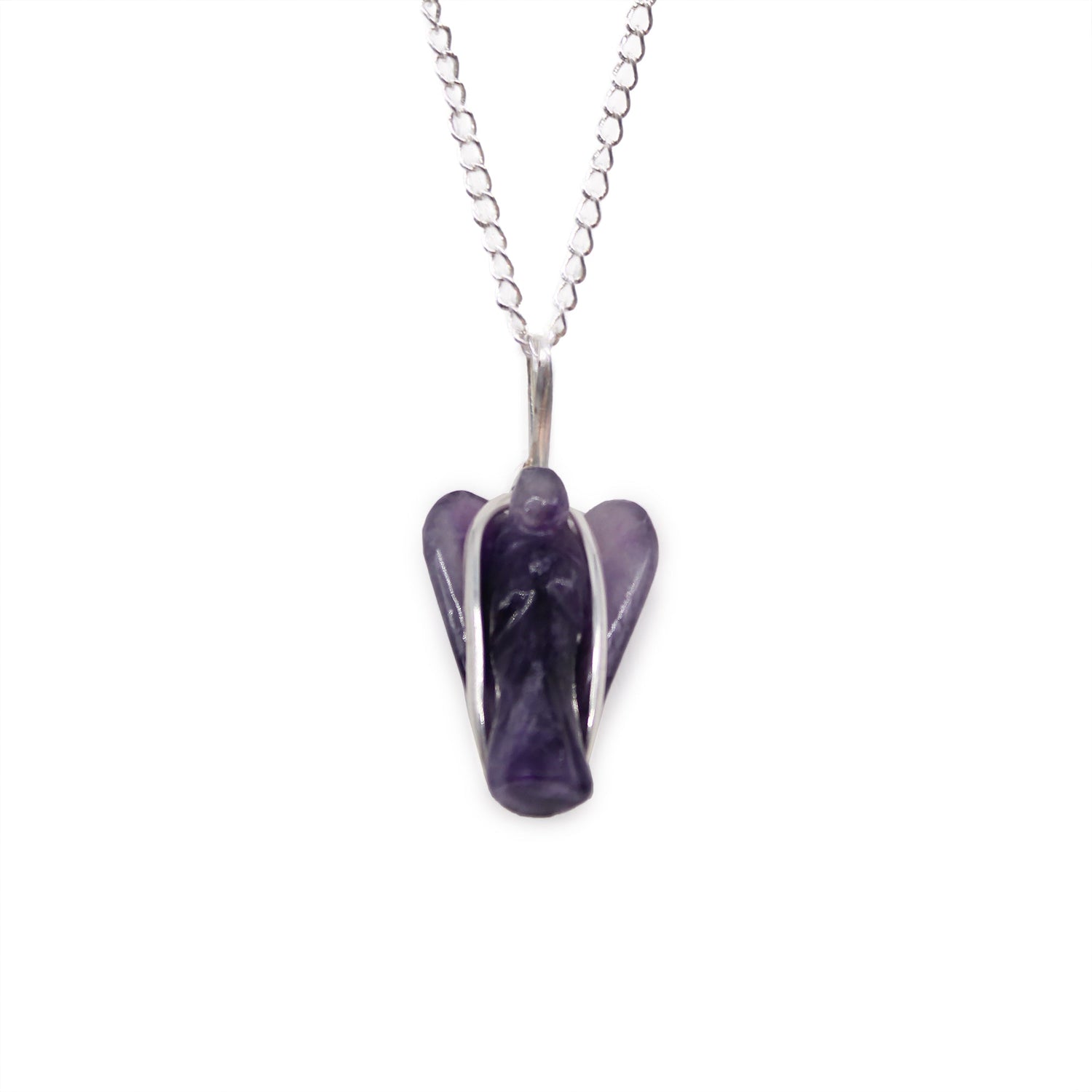 The pendant is polished amethyst, its purple gently veined with lighter marbling that makes each piece subtly unique. Across many traditions, amethyst is appreciated for its calming color and associations with clarity and reflection—qualities that suit a piece worn every day. The angel motif is widely seen as a symbol of protection, guidance, and compassion, offering a gentle reminder of care and watchfulness in daily life. A simple metal bail and jump ring keep the focus on the stone and its form. 💜✨