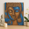 Stylizovaná tvář Buddhy spočívá se zavřenýma očima, přičemž jedno oko je jemně dotčeno modrou barvou. Řady malých kruhových tvarů tvoří vlasy, zatímco hustá tečkovaná práce a kovové zvýraznění přidávají hmatovou hloubku a jemný lesk. Listovitá větev vlevo vyvažuje kompozici. Umělecké dílo pokračuje po okrajích pro čistý, bezrámový vzhled a podpis umělce je umístěn v pravém dolním rohu. ✨
