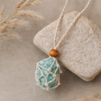 Povrch kamene je nepravidelný a živý s tóny mořského skla, uložený v úhledné bílé macramé síti, která ho pevně drží a zároveň nechává světlo hrát na jeho fasetách. Hladká, kulatá korálka v teplé hnědé barvě přidává jemnou pauzu mezi šňůrou a krystalem, vyvažující texturu a tón. Zapínání bez spony udržuje vzhled čistý a nenucený. 🌿