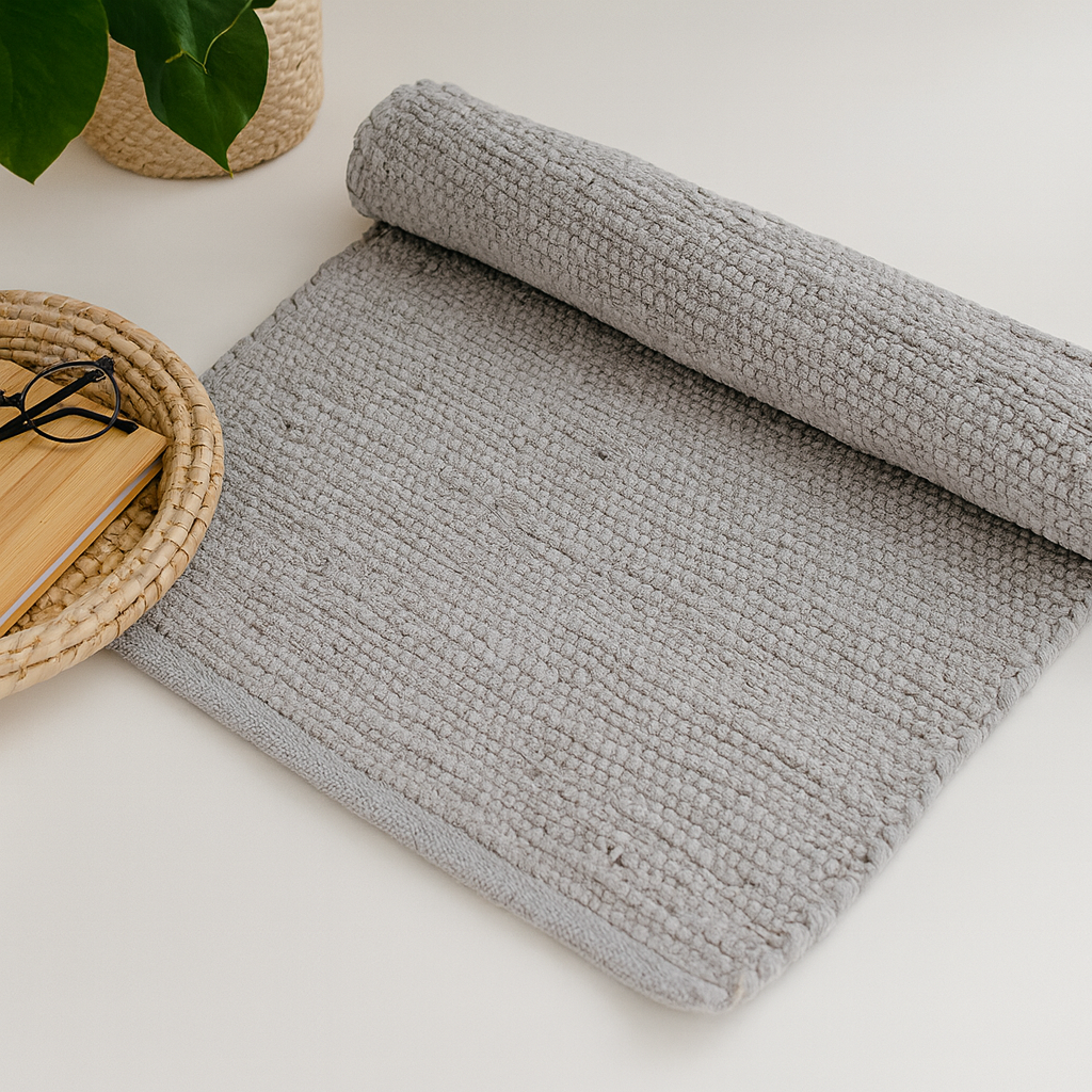 Pod nohama bavlna působí pevně a tiše, dodávajíc místnosti klidnou atmosféru. Měkký, kamínkový povrch tlumí každý krok, zatímco světle šedý odstín se snadno začlení mezi vaše zařízení. 🌿
