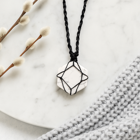 Běžná cena £328Jednotková cena /NedostupnéSklademNáhrdelník s přívěskem z bílého howlitu ve tvaru šestiúhelníku s nastavitelným šňůrkou
