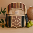 Ponořte se do smyslového potěšení kontrastních látek. Přední panel, pečlivě tkaný v Káthmándú, představuje tapisérii přírodní béžové, tmavě modré, červené, vínové, zelené, hořčicově žluté, černé a krémové barvy. Vertikální pruhy a geometrické motivy tančí po povrchu, jejich rytmus přerušuje pouze rybí kost v dolní části přední strany. Boční části z hladší tmavé látky nesou tichou sílu, slib trvanlivosti. Světlé zipové pásky s kovově vypadajícími jezdci a černými šňůrkami dodávají tomuto etnicky inspirovanému designu nádech modernosti. 💼