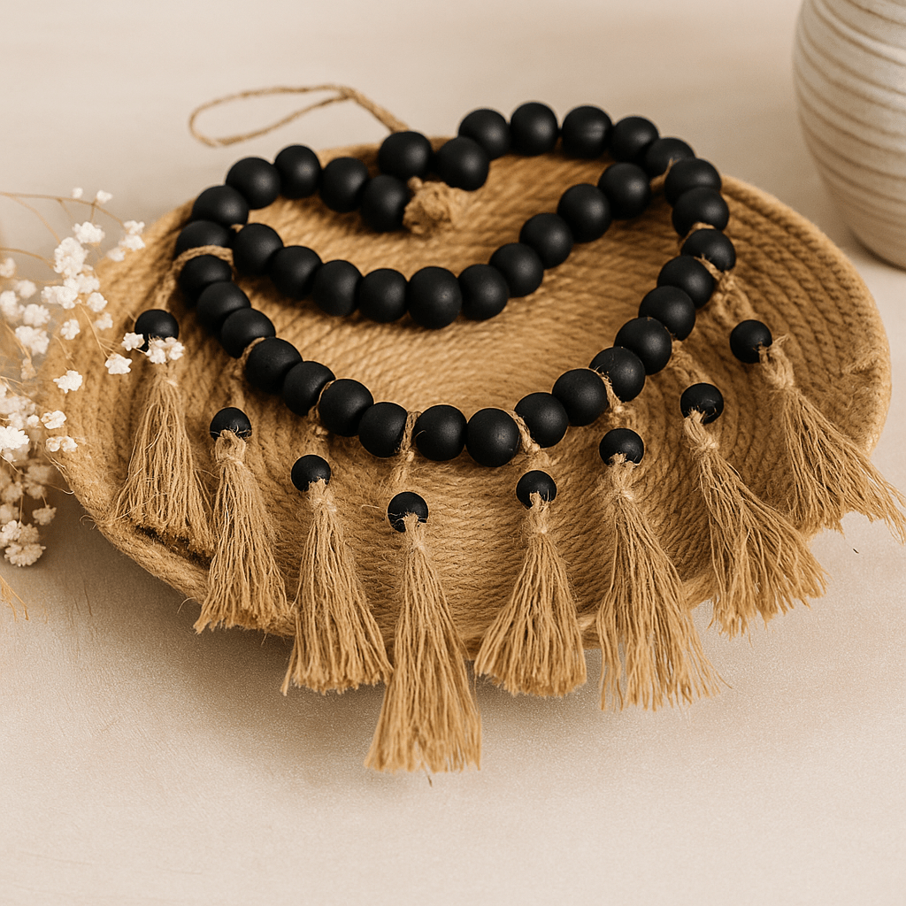 Textura je klidná a příjemná na dotek — hladké, černé kulaté korálky navlečené na přírodní, kroucené šňůrce. Podél spodní části měkké béžové střapce s lehce roztřepenými konci přidávají jemný lem. Malé oddělovací korálky rytmicky doplňují linii. Vertikální tok — od smyčky nahoře po padající střapce — přitahuje pohled dolů a dává zdi pevnou, vyváženou přítomnost. Zavěste ji za smyčku na kolík, háček nebo jednoduchý hřebík; usadí se s jemným klidem a slabým šelestem, když se vzduch pohne.